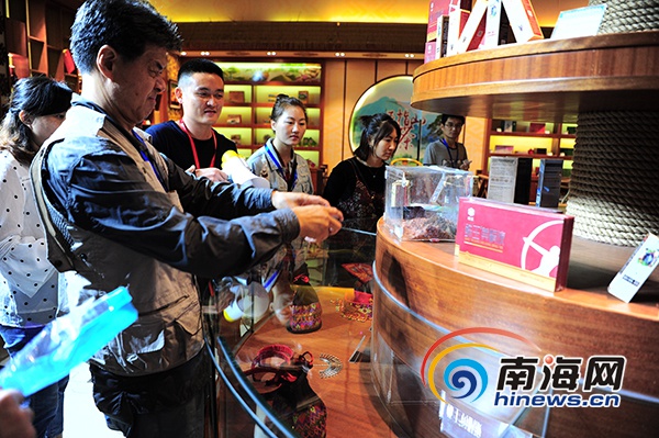 走進展示區,“琥珀湯奶蜜香”的水滿紅茶正在講述一代代茶農的勞作與收獲,富有民族特色的黎錦苗繡正在展示那絢麗多彩的民族記憶,土蜂蜜、百香果、山蘭米、憂遁草等一百多款五指山特色農產品有序排列,吸引了采訪團成員或駐足觀看,或拍照留念。