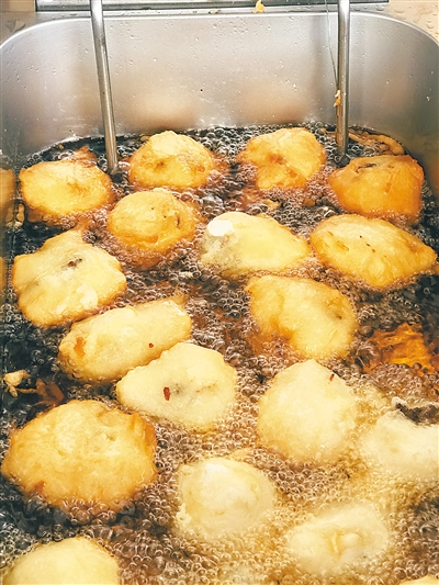 ?正在油炸中的鴨柳仔。 符宗瀚 攝