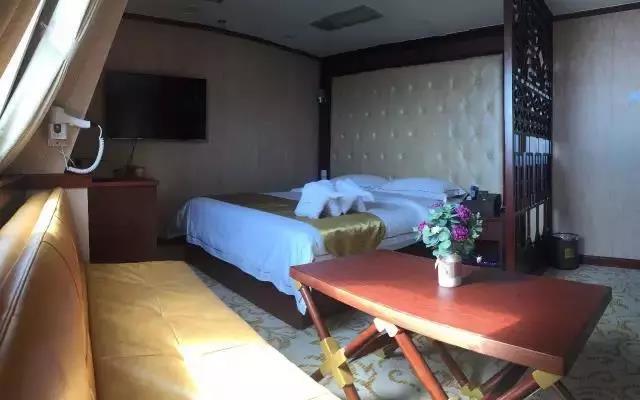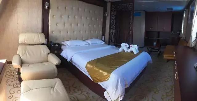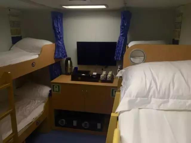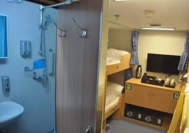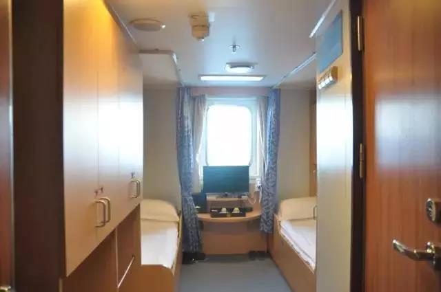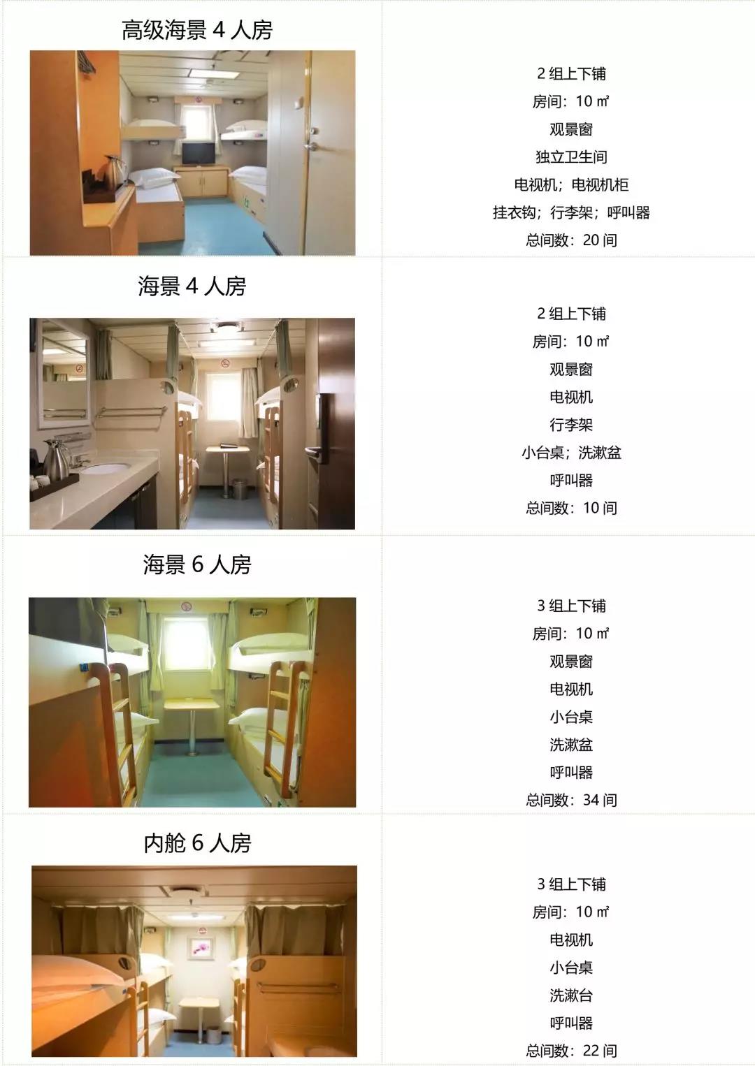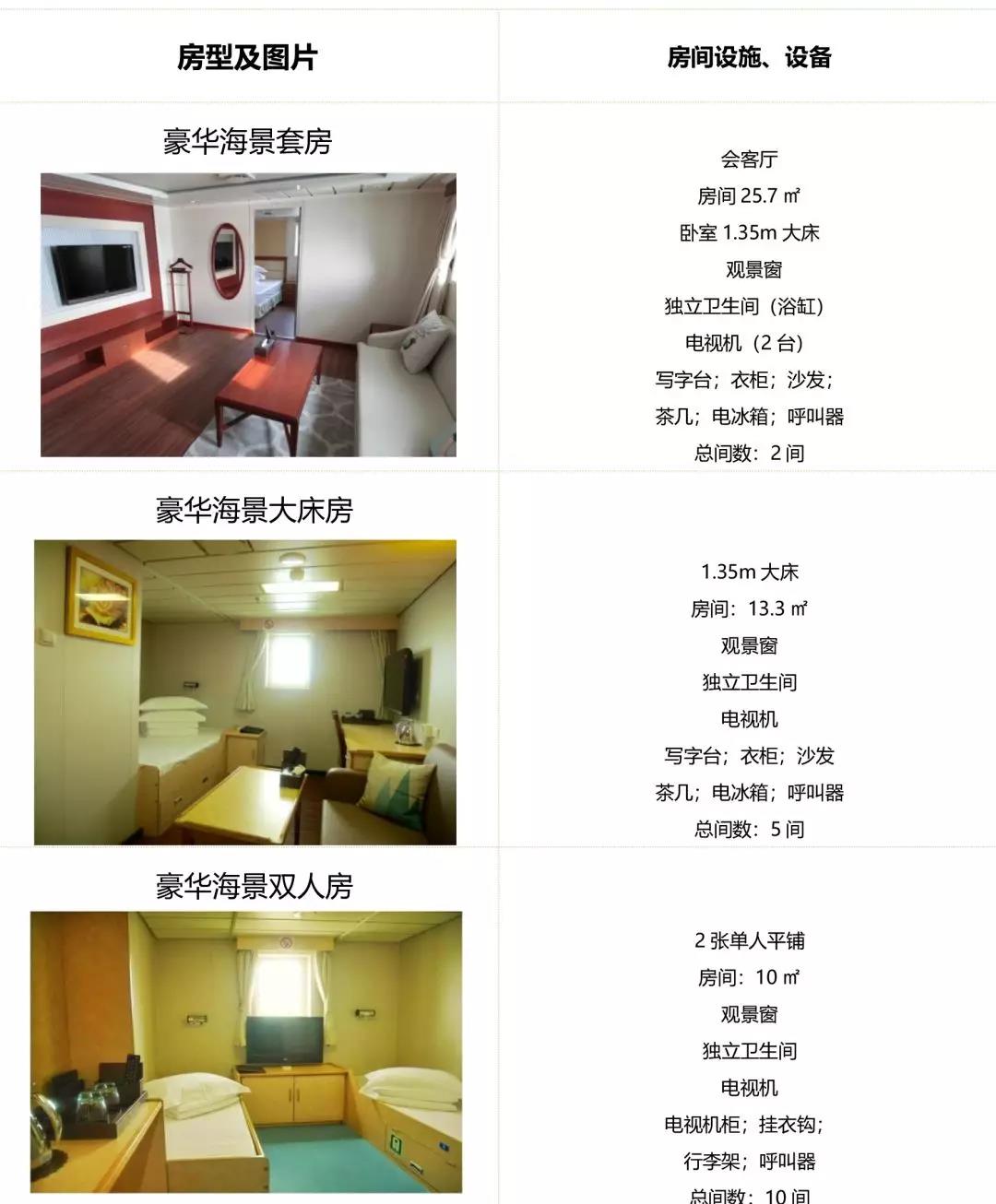 ▲ 房間設施:海景窗 | 獨衛 | 洗漱盆 | 電冰箱 | 電視機 | 寫字臺 | 衣柜 | 沙發 | 茶幾 | 行李架(備注:可住2人,如住第三人按最低艙位價格收取)