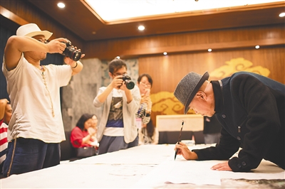 來海南參加兩岸筆會的畫家尼瑪澤仁在兩岸畫家聯袂創作的畫作上題款。 海南日報記者 宋國強 攝