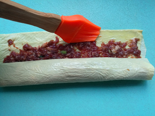 5.把油豆皮一邊卷起來,卷得慢一些,卷緊,油豆皮的邊上刷上蛋液,這樣一會兒蒸的時候不會散開。