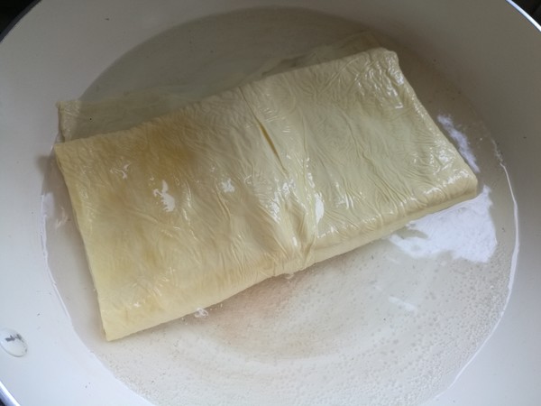 2.買回來的油豆皮需要先過一遍開水,不需要時間太久,20秒就可以了。開水燙一下一來可以殺滅細菌,二來豆皮變得柔軟,容易卷起來。