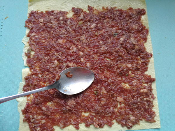 3.油豆皮稍微晾涼,切成長方形片狀。我切的大概是長20cm,寬16cm的長方片。你也可以按照自己喜歡隨意切。取過來一張鋪在案板上,鋪上調好的牛肉餡,用勺子背整理平整。