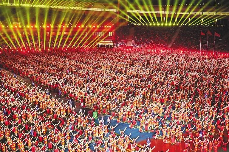 ↑萬人竹竿舞表演活動現場,600個方陣整齊劃一起舞。張茂 攝