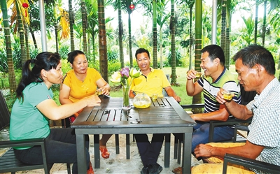 澄邁金江鎮大美村的村民們在檳榔樹下喝蓮花茶。 本報記者 蘇曉杰 通訊員 王家專 攝