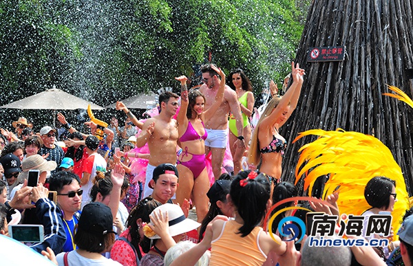?1月29日,外國游客身著泳裝在“雪”中嬉戲。 南海網記者 沙曉峰 攝