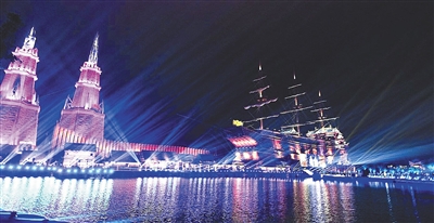 夜晚的海口長影環球100奇幻樂園燈光璀璨。 (資料圖)