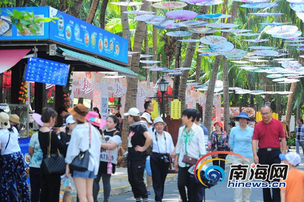 椰林綠道上的“傘廊”別具風(fēng)情,游客們紛紛拍照留影。南海網(wǎng)記者 沙曉峰 攝