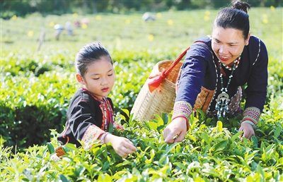 在白沙五里路茶園,黎族小女孩跟隨媽媽學習采茶。 海南日報記者 蘇曉杰 攝