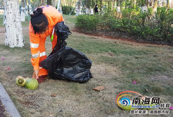4月29日上午7點多,在西海岸環衛工人忙著撿起丟在草皮上的椰子殼。據環衛工人反映,隨著天氣炎熱,一些游客和市民經常偷摘西海岸椰樹上的椰子。喝過以后隨處亂丟,給他們工作帶來來不便。呼吁市民游客做一個文明的游客,愛護環境。