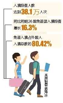 “通過免簽政策來瓊已經成為外國游客的首選方式,超過8成外國人通過該政策來瓊旅游。”海口出入境邊防檢查總站邊檢處負責人劉俊吉告訴海南日報記者,去年5月1日,國家移民管理局出臺59國人員入境旅游免簽政策支持海南自貿區自貿港建設。免簽政策落地實施一年,海口邊檢總站梳理政策實施過程中出現的各類情況,總結法律法規配套制定、邊檢工作面臨的挑戰等問題,提出“優化申報模式、加強免簽政策宣傳、適時擴大免簽國家”等工作建議,該政策實施一年來,吸引外國游客成效顯著,其中免簽入境占外國人入境總數的80.42%。  為確保免簽政策順利實施,海南省公安廳充分發揮海南省外國人服務管理工作領導小組辦公室的作用,從多個方面著手,保障免簽政策順利實施。完善省相關職能部門的協作機制,定期組織召開聯席會議研究解決免簽政策執行中的相關問題,印發工作簡報,形成全省外國人服務管理工作一盤棋格局;簡化通關環節。經報請國家移民管理局同意,免簽外國人免填入出境卡,為免簽外國人通關提供便利;加強全省外管隊伍建設,增加全省外管隊伍力量,加強業務培訓工作,提高外管人員素質;強化信息系統建設,優化升級免簽外國人預申報系統,實現出入境、邊防檢查部門預申報平臺合一,為旅行社申報信息提供便利;做好服務工作,為有需要前往內地的免簽人員辦理簽證證件。