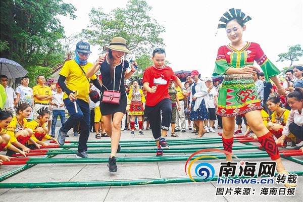 5月2日,游客在三亞南山文化旅游區跳竹竿舞。當天,三亞南山景區接待中外游客2萬余人次。