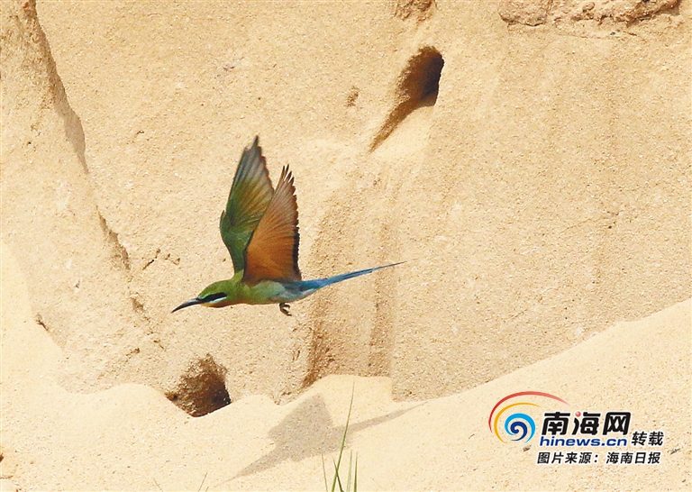 今年3月29日,為了讓蜂虎繼續在五源河下游繁殖,秀英區濕地保護管理中心在五源河下游為蜂虎營造棲息地。棲息地營造完成后,吸引了許多蜂虎在此筑巢。