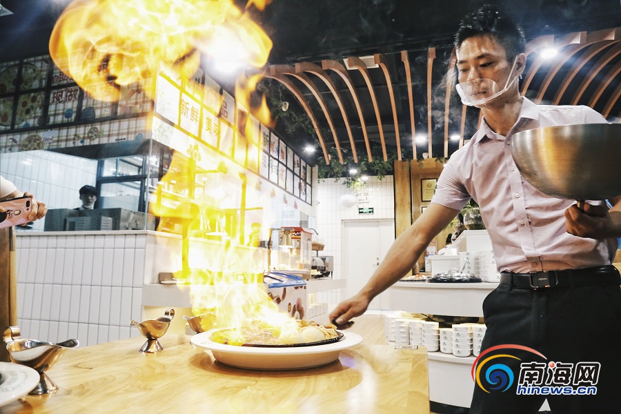 師傅點上火,火焰躥上40厘米高,一道美味的火焰牛排隨之制成。南海網(wǎng)記者 姚皓 攝