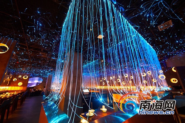 魚鮮生的老板王經(jīng)武是一位80后的臨高帥哥,他為記者一一講述了這家餐廳設(shè)計的初衷:“坐在座位上,環(huán)顧四周,墻壁上是海洋的元素,有魚眼,有水泡,顧客會有在海底餐廳用餐的感覺。這時你再抬頭,就能看到滿天的星光。”