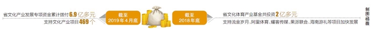 有政策支持,更有“真金白銀”的資助。截至2019年4月底,省文化產(chǎn)業(yè)發(fā)展專項資金累計撥付6.9億多元,支持文化產(chǎn)業(yè)項目469個。截至2018年底,省文化體育產(chǎn)業(yè)基金共投資2億多元,支持流金歲月、阿里體育、耀客傳媒、果派聯(lián)合、海南游禮等項目加快發(fā)展。