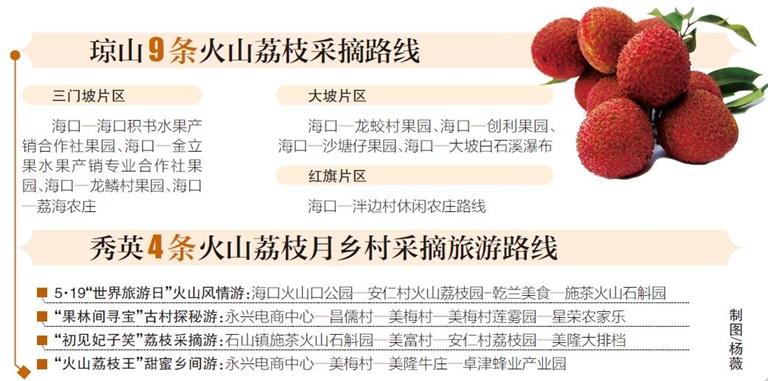 近日,海口瓊山區(qū)精心設(shè)計了9條火山荔枝采摘游線路,幫助市民游客更方便地感受采摘火山荔枝的樂趣。與此同時,海口秀英區(qū)也策劃了4條火山荔枝親子農(nóng)旅采摘路線,引領(lǐng)市民游客走進(jìn)火山墻內(nèi)的荔枝園、蓮霧園,采摘田間熱帶瓜果,品嘗當(dāng)?shù)靥厣r(nóng)家美食,體驗火山田園風(fēng)情。