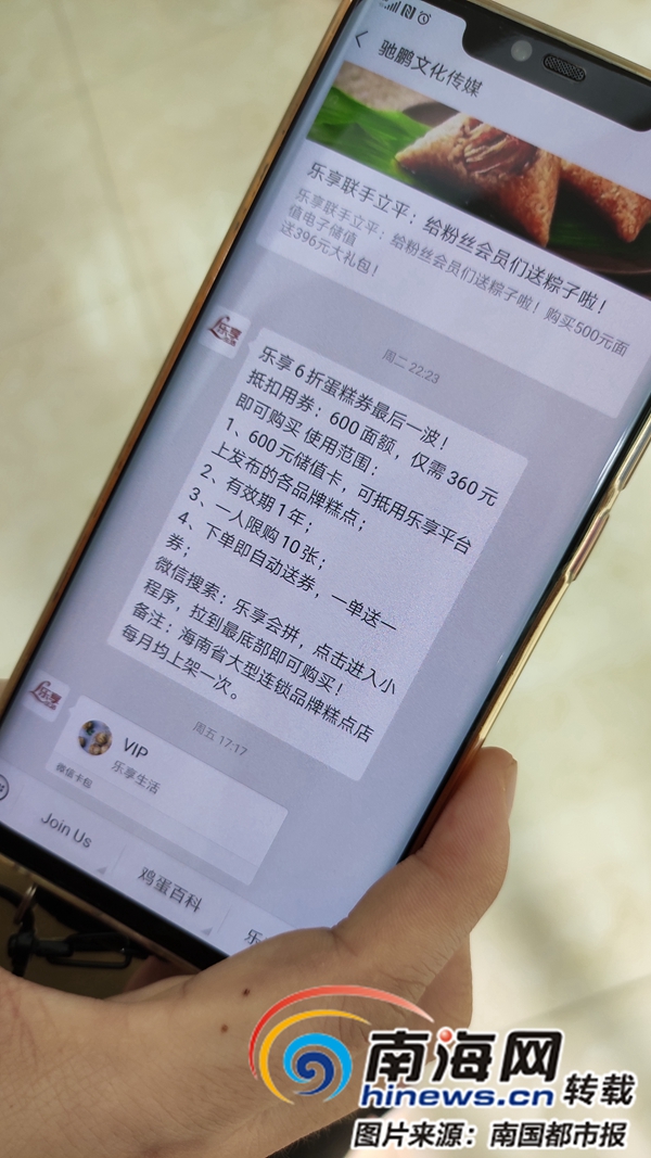 南國都市報5月19日訊(記者 王康景 文/圖)海口一公司通過“樂享團(tuán)購”活動,發(fā)展線下“團(tuán)長”吸引群眾“入群”參與各類優(yōu)惠卡團(tuán)購活動,包括加油卡、超市購物卡、糕點店卡、水果品牌連鎖店購物卡等等,按照6折至9折不等的優(yōu)惠出售給“團(tuán)員”。然而,很多人付款后發(fā)現(xiàn),公司不及時發(fā)卡,或者所發(fā)卡并無金額。19日,海口不少參加團(tuán)購優(yōu)惠卡的市民向公安機關(guān)投訴海南馳鵬文化傳媒公司涉嫌欺詐和非法集資,所涉金額數(shù)百萬元。目前,事件還在進(jìn)一步調(diào)查中。