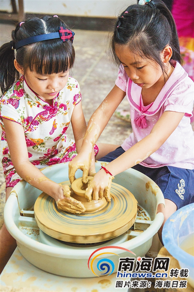 福山咖啡風(fēng)情小鎮(zhèn),孩子們在體驗(yàn)制陶。海南日報(bào)記者 李幸璜 攝