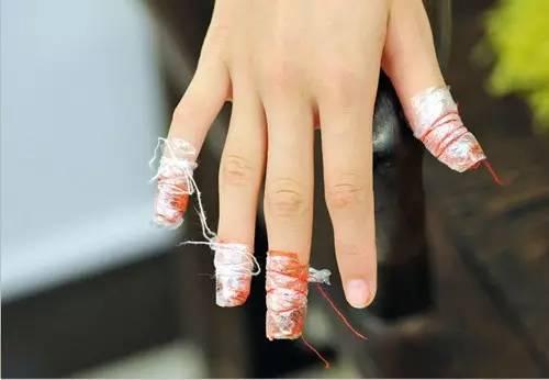 在定安、瓊中等部分市縣,端午節會給女孩子染指甲。把指甲花搗碎,放在指甲上,再用特有的葉子包住,用包粽子的麻繩綁好。關于端午染指甲,還有著這樣一句俗語“五月端午染指甲,蝎子蟲子不咬娃”。