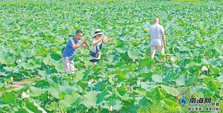 6月18日,在海口市龍華區龍泉鎮涵泳村的千畝荷塘,綻放的荷花吸引不少市民游客前來觀賞留影。海南日報記者 陳元才 攝