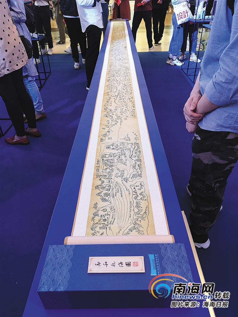 鄭和航海圖絲綢長卷,圖中記載了航線所經過的500多個亞非各國地名,以及50多條不同的往返線路。圖中清楚標明了海南古時地名瓊州府、萬州、銅鼓山等地,見證了海南在古代海上絲綢之路上的重要地位;