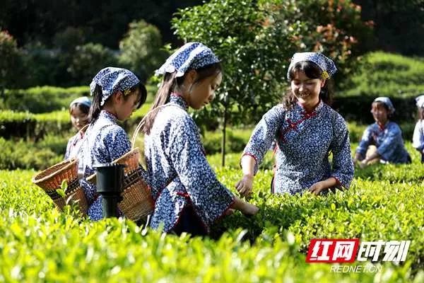 湖南辰龍關碣灘茶莊園里,姑娘們正在采茶。