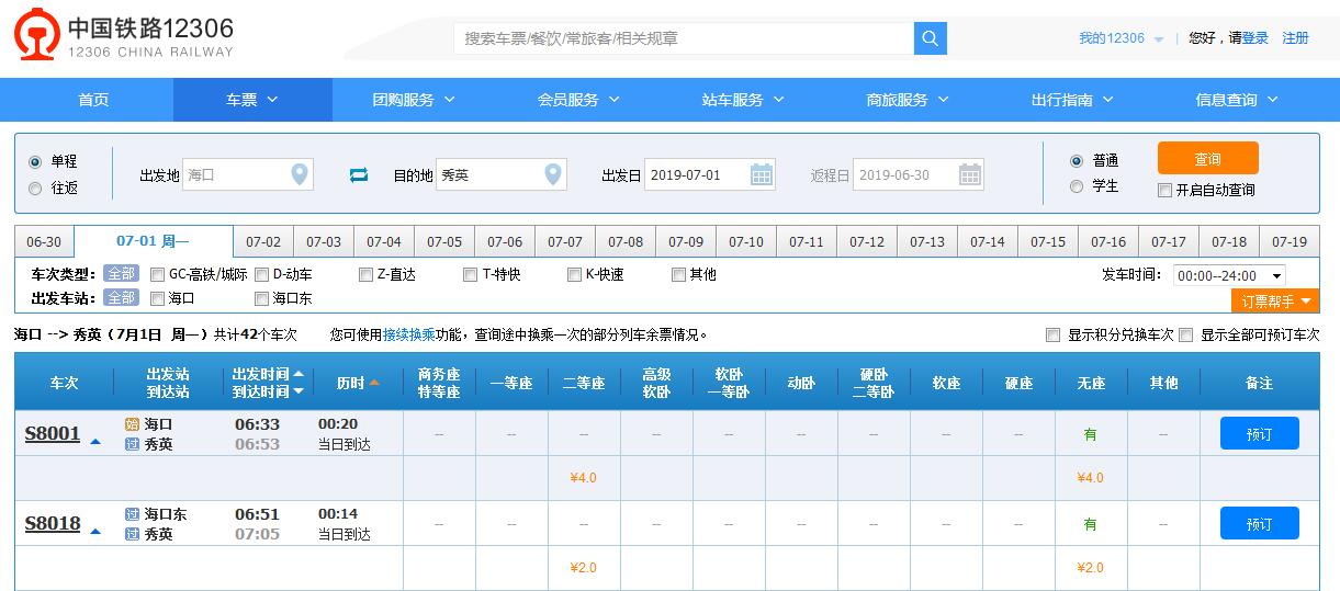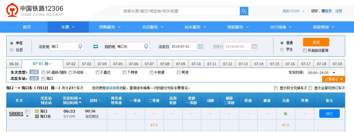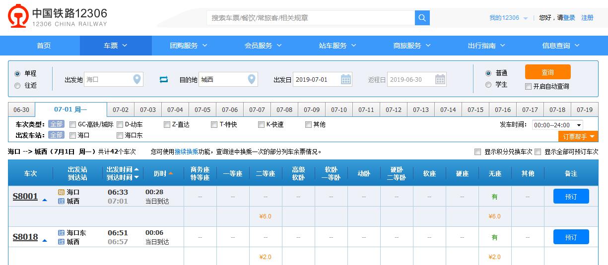 海口站至城西站票價為6元,用時28分鐘;