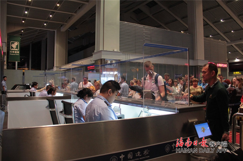 美蘭邊防檢查站民警為搭乘夜航班機抵達海口的59國免簽入境旅客辦理入境邊防檢查手續。攝影 李柳清