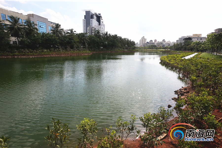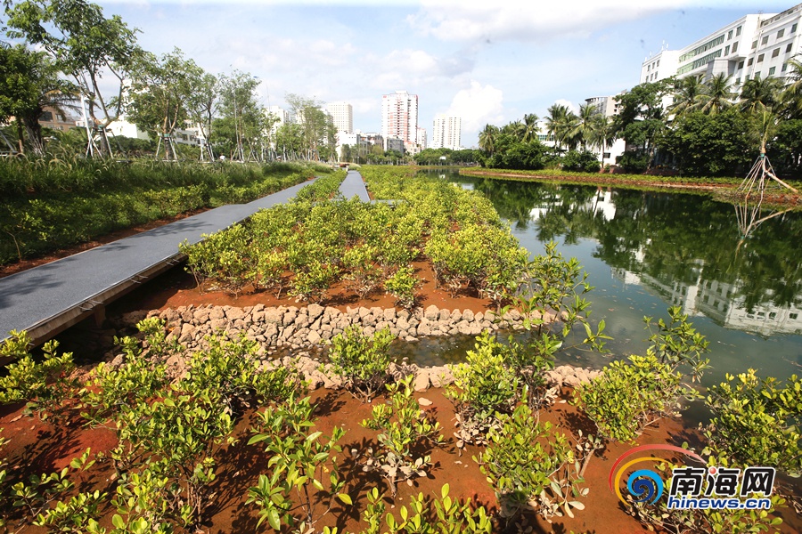 當天下午,記者在位于海口市人民醫院北側的鴨尾溪河岸看到,這里的河道兩側淺水區都種上了紅樹苗,翠綠的紅樹苗沿著親水棧道延伸環繞附近河道,和碧水交相輝映,頗具景觀效果。