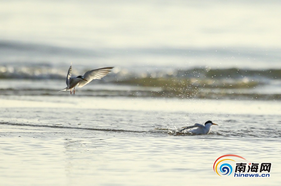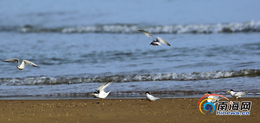 7月11日,在海口五源河國家濕地公園,成群結隊的白額燕鷗在海灘上棲息覓食。海報集團全媒體中心記者 陳元才 攝