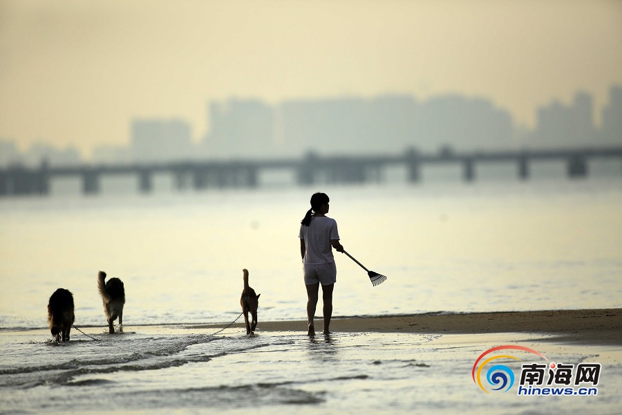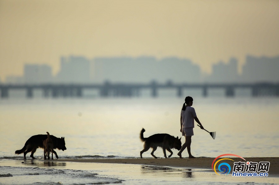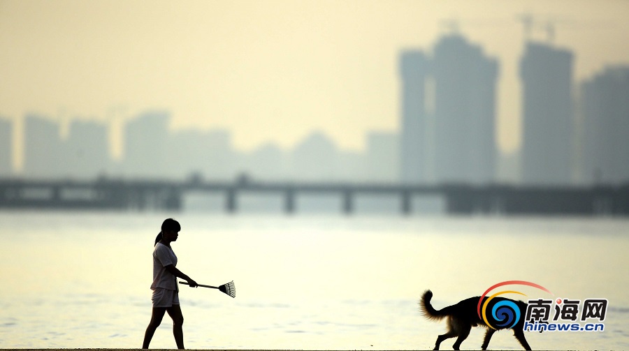 海南旅游頭條、南海網、南海網客戶端海口7月11日消息(海報集團全媒體中心記者 陳元才)7月11日,在海口西海岸,清晨的海面上太陽初升,朝霞滿天,海灘上市民遛狗休閑,游客賞海,組成一幅幅靚麗的風景畫。