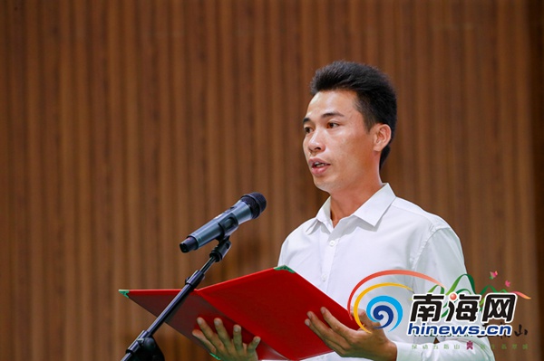 “毛陽,生我養我的地方!你用昌化江的乳汁哺育我,你用鶯歌嶺的甘露洗禮我,你用五指山的臂膀愛撫我。”五指山市毛陽鎮農民代表王亞波帶來了朗誦《毛陽,我的家鄉》,雖然普通話并不是特別標準,但他認真朗讀的樣子獲得了現場觀眾的鼓勵與點贊。