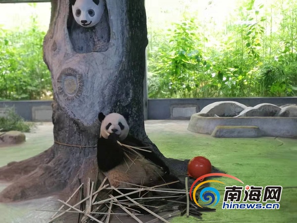 海南熱帶野生動(dòng)植物園內(nèi),“萌寵”熊貓?jiān)诔灾褡印D虾>W(wǎng)記者 蘇靚 攝