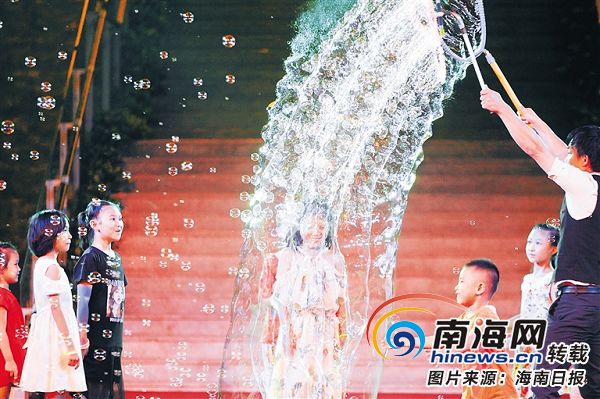 活動表演現場,泡泡表演藝人在舞臺上與小朋友們進行互動。