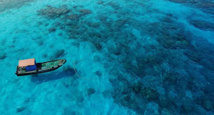這是西沙永樂群島的甘泉島附近的海面(2017年4月23日無人機拍攝)。新華社記者 郭程 攝