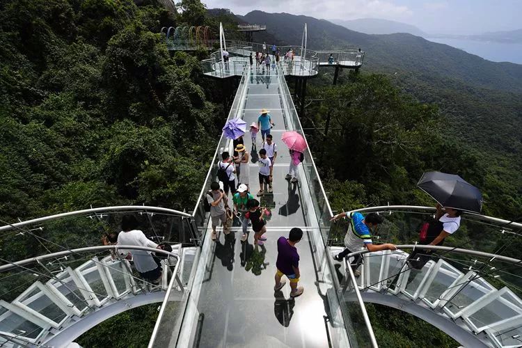 游客在三亞市亞龍灣熱帶天堂森林公園的玻璃棧道上參觀游覽(2018年8月31日攝)。新華社記者 郭程 攝