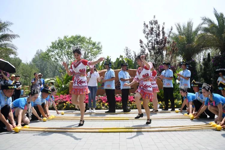 7月21日,演職人員在北京世園會海南園表演竹竿舞。新華社記者 張晨霖 攝