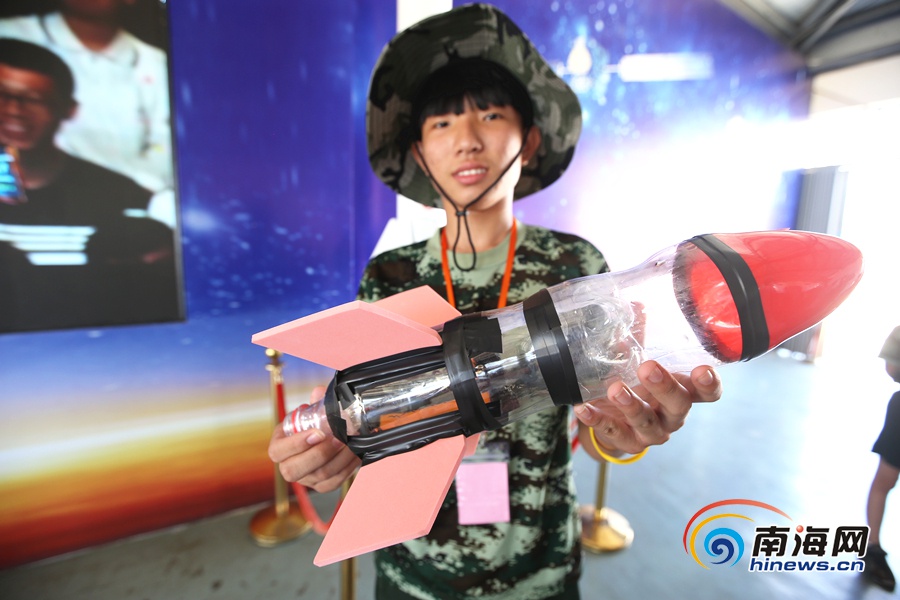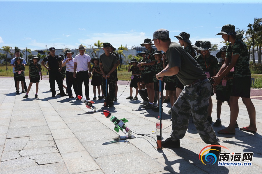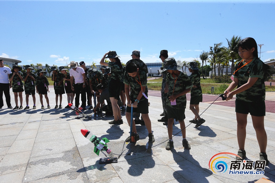 瓊海留守(困境)兒童夏令營營員自制水火箭進行模擬發射。南海網記者 陳望 攝