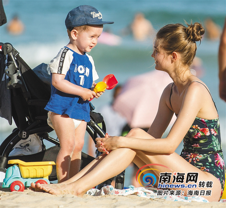外國游客在三亞大東海海灘休閑。