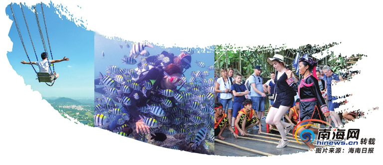 游客在呀諾達雨林文化旅游區體驗懸崖秋千。游客在陵水分界洲島旅游區潛水。游客在檳榔谷黎苗文化旅游區體驗竹竿舞。