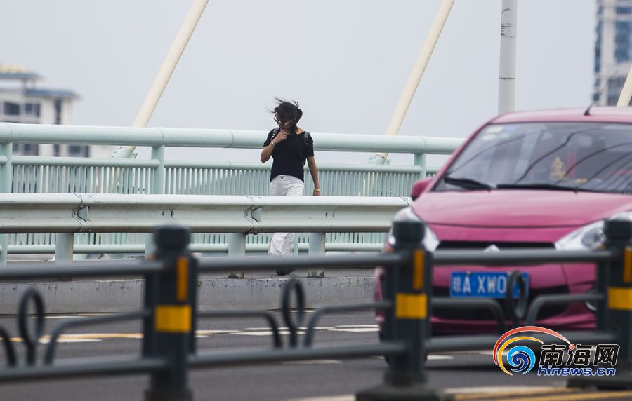 圖為??谑兰o(jì)大橋上,行人的頭發(fā)被大風(fēng)吹得凌亂。南海網(wǎng)記者 劉洋攝