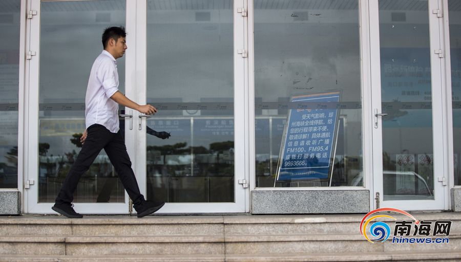 ??谛潞8酃ぷ魅藛T設(shè)立停航提示牌,提醒過(guò)海旅客。南海網(wǎng)記者 劉洋攝