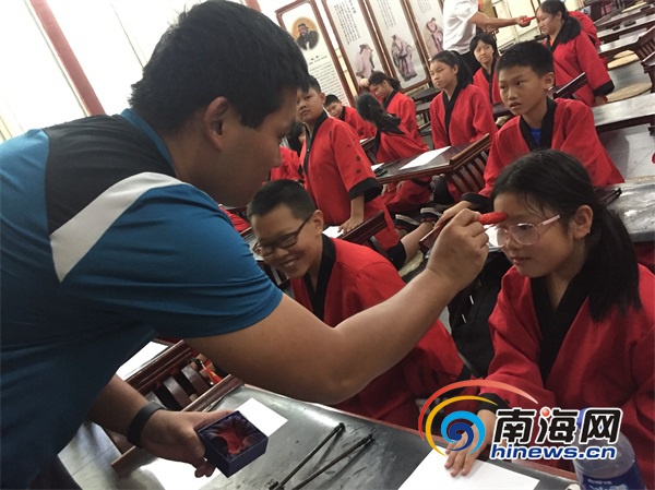 南海網(wǎng)小記者北京逐夢研學(xué)營老師給營員點額間朱砂。南海網(wǎng)記者 林鴻羽 攝