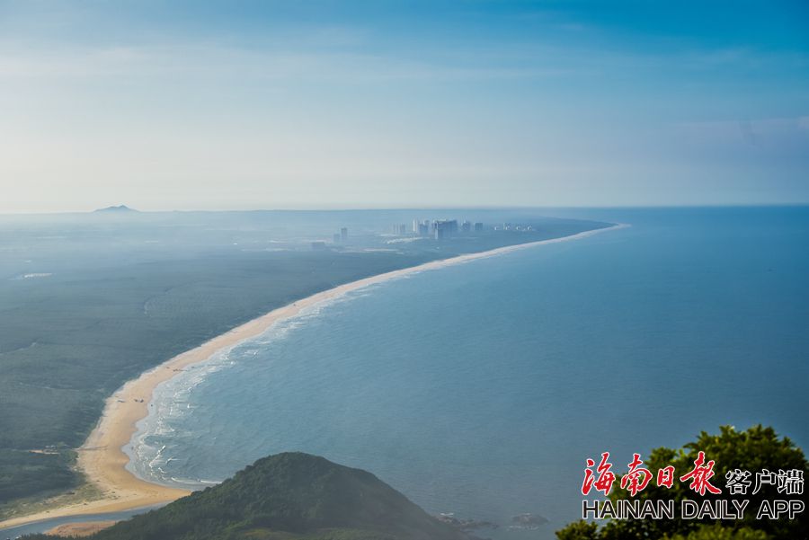 2019年8月6日,在文昌銅鼓嶺景區的山頂觀景臺俯瞰月亮灣,25公里蜿蜒曲折的海岸線,如同一鉤明亮的彎月;南海層層疊疊的滔滔白浪如銀白色的緞帶,漣漪萬千;海中一座座小島、礁石好似中流砥柱迎接著海浪的拍擊。海南日報記者袁琛 見習記者封爍 攝影報道
