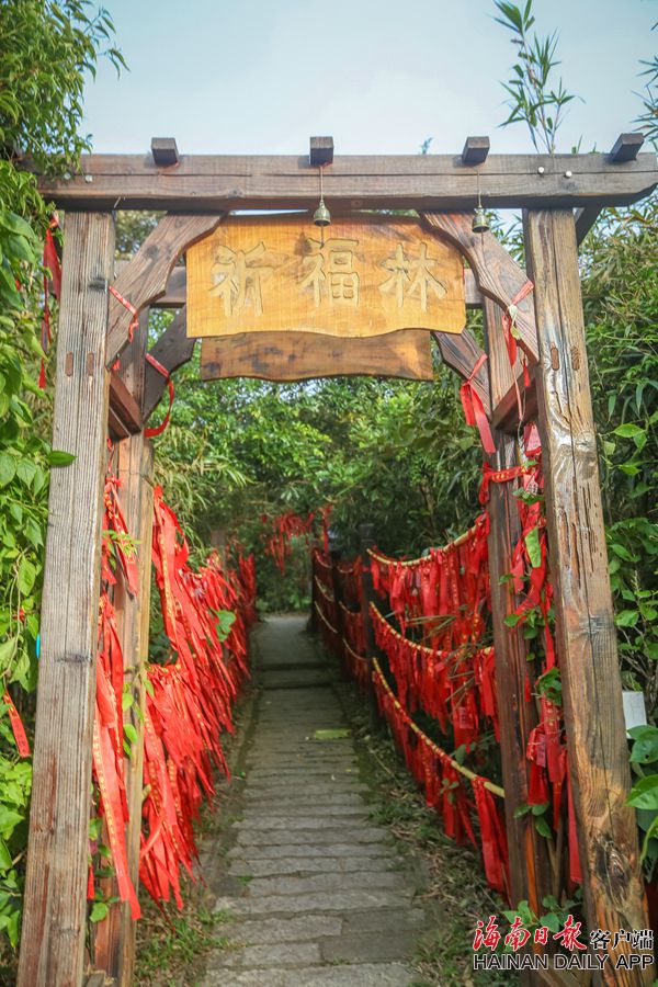 嶺上植被生長繁茂,種類眾多,獸類有20多種,鳥類有60多種,形成了一座天然的生態植物園、百草園和野生動物園。還有奇巖異石,千姿百態,形成了一座幽邃迷人的海濱石景公園。 圖為祈福林。海南日報記者袁琛 見習記者封爍 攝影報道
