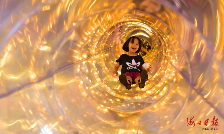 小朋友在尋嘗里美俗夜市內的管道滑梯玩耍。海口日報記者 黃一冰 攝