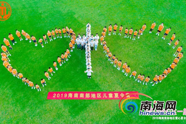 8月16日上午,2019海南南部地區困境(留守)兒童夏令營正式落下帷幕。孩子們正在航拍留影。 三亞市民政局供圖