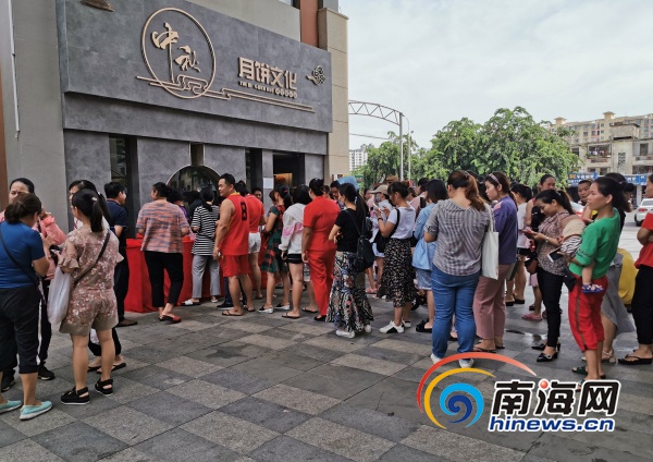 當天一大早,海口水晶宮酒樓旁已圍滿顧客。他們排著隊領到了自己早早預定的月餅,也有人在現場看到了金黃可口的月餅,忍不住往購物袋里添了幾盒。