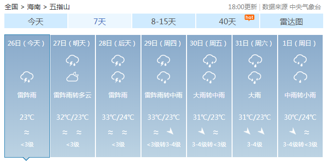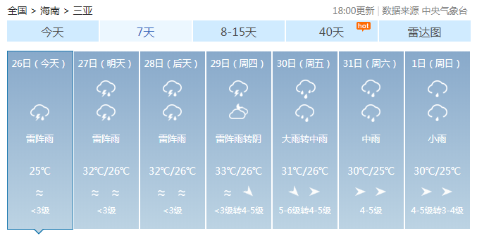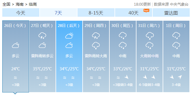 海南省氣象局預(yù)計,8月26日~29日,全島以多云天氣為主,局地有雷陣雨;8月30日~9月1日,受熱帶氣旋影響,海南島陸地和近海將有一次強風(fēng)雨天氣過程。